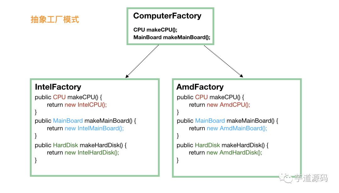 单独看 CPU 工厂和主板工厂,它们分别是前面我们说的工厂模式 。这种方式也容易扩展,因为要给电脑加硬盘的话,只需要加一个 HardDiskFactory 和相应的实现即可,不需要修改现有的工厂。