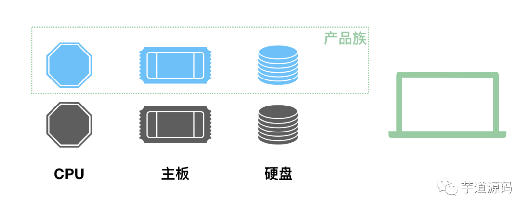 下面就是我们要说的产品族 的概念,它代表了组成某个产品的一系列附件的集合: