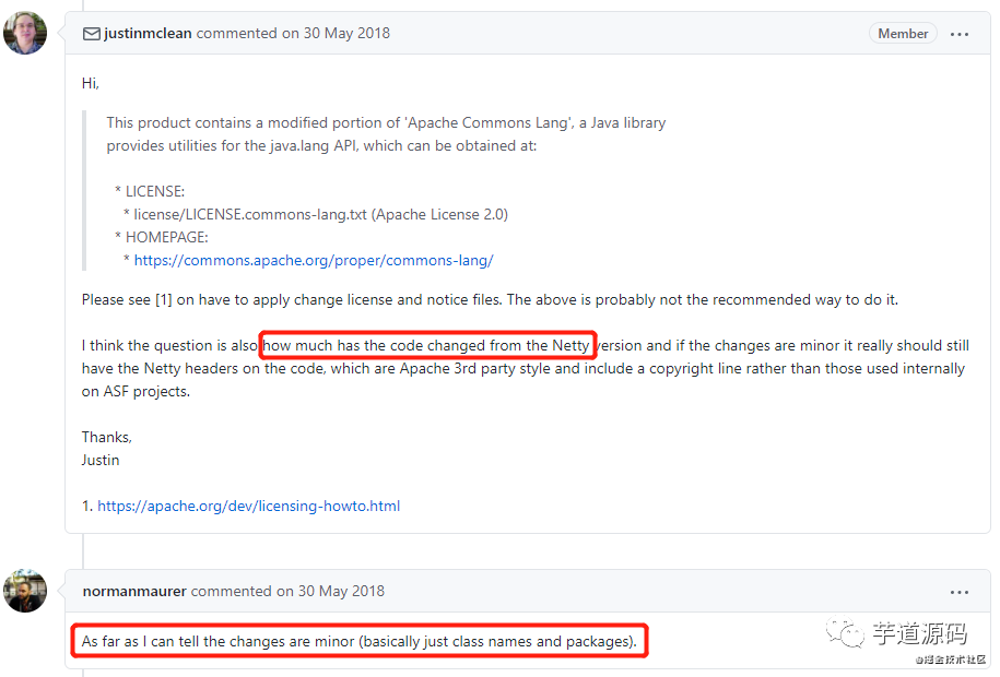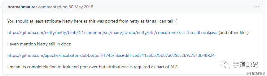 哥们,你这个东西我怎么觉得是从 Netty 那边弄过来的呢?本着开源的精神,你直接弄过来是没有问题的,但是你至少得按照规矩办事吧?得遵循 AL2 协议来。而且我甚至看到你在你的 pr 里面提到了 Netty 。