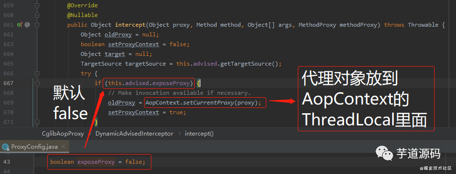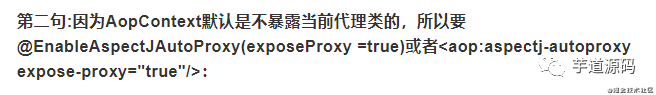 而这个 if 判断的配置默认是 false,所以需要通过刚刚说的配置修改为 true,这样 AopContext 才会生效。