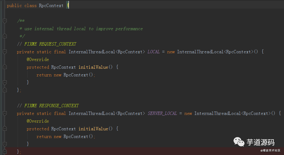 RpcContext 这个对象里面维护了两个 InternalThreadLocal,分别是存放 local 和 server 的上下文。