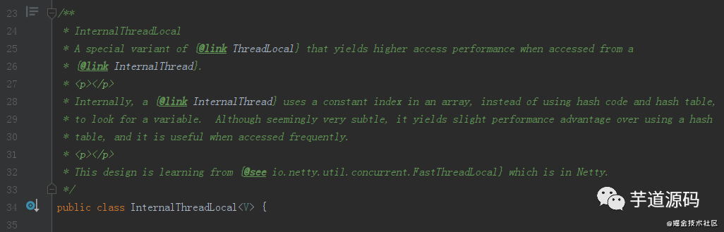 InternalThreadLocal 是 ThreadLocal 的一个变种,当配合 InternalThread 使用时,具有比普通 Thread 更高的访问性能。