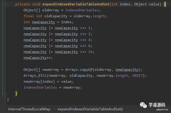 在 InternalThreadLocalMap 中扩容就是变成原来大小的 2 倍。从 32 到 64,从 64 到 128 这样。
