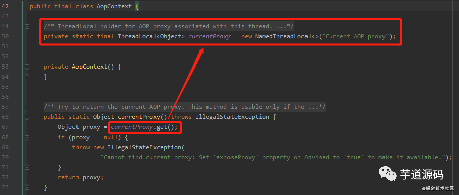 可以看到,经过一个 if 判断,如果为 true ,则调用 AopContext.setCurrentProxy 方法,把代理对象放到 AopContext 里面去。