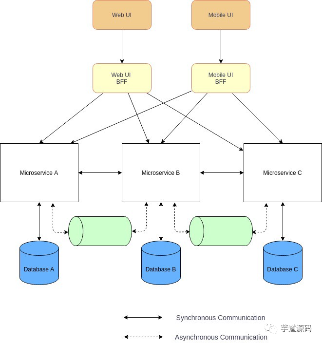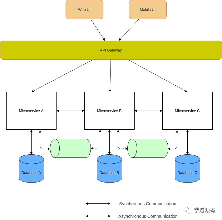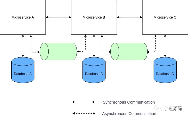 在服务可以同步交换数据(例如,通过 API)的简单微服务架构中。