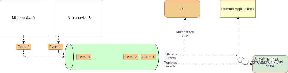 在这些场景,可以基于事件的架构使用事件源模式。在传统数据库中,直接存储的是业务实体的当前“状态”,而在事件源中任何“状态”更新事件或其他重要事件都会被存储起来,而不是直接存储实体本身。这意味着业务实体的所有更改将被保存为一系列不可变的事件。因为数据是作为一系列事件存储的,而非直接更新存储,所以各项服务可以通过重放事件存储中的事件来计算出所需的数据状态。