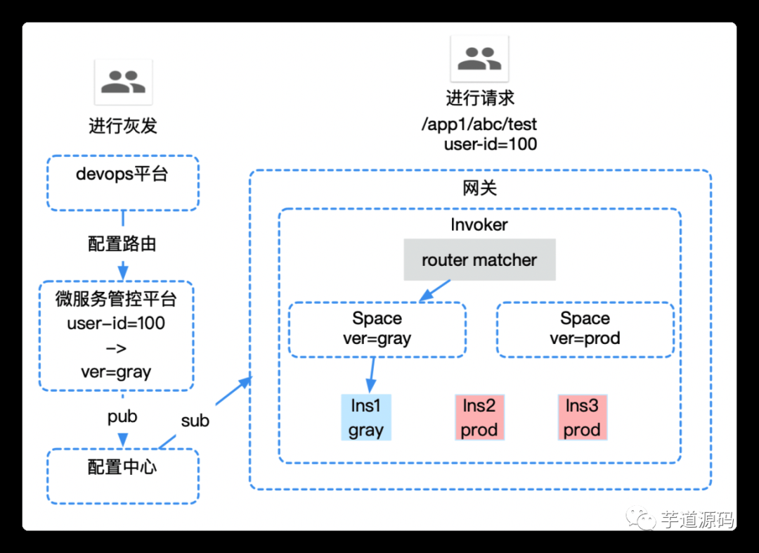 条件路由的功能结合devops平台发布管理可以很容易实现灰度发布。如下图所示我们将用户id是100的请求分发到灰度版本上进行内部测试。