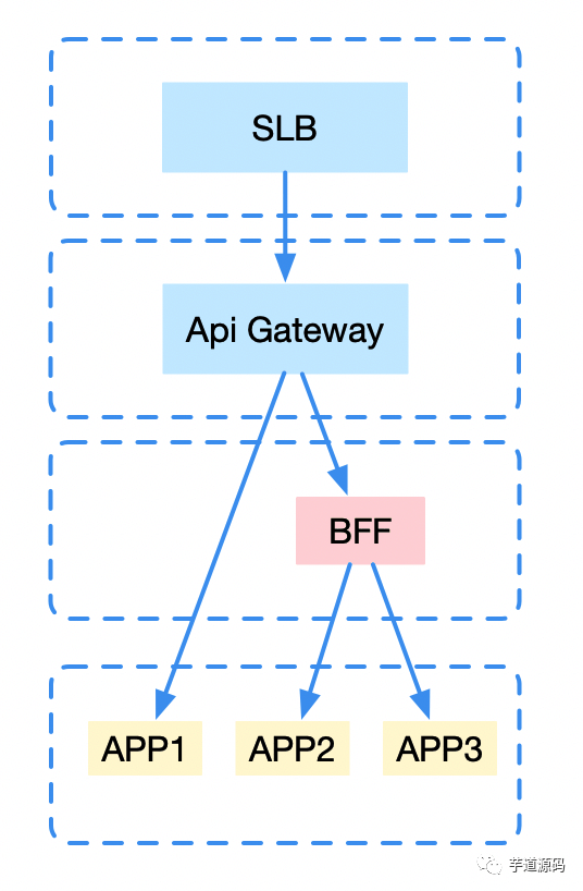 我们的Api网关目前的架构如上所示,可以看到Api网关处于一个什么位置,往上承接所有的南北流量,往下会分发流量到微服务应用或者BFF聚合应用,在BFF规范化之前我们仍然将其视为一个普通微服务应用。