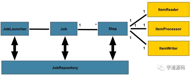 在spring batch中一个job可以定义很多的步骤step,在每一个step里面可以定义其专属的ItemReader用于读取数据,ItemProcesseor用于处理数据,ItemWriter用于写数据,而每一个定义的job则都在JobRepository里面,我们可以通过JobLauncher来启动某一个job。