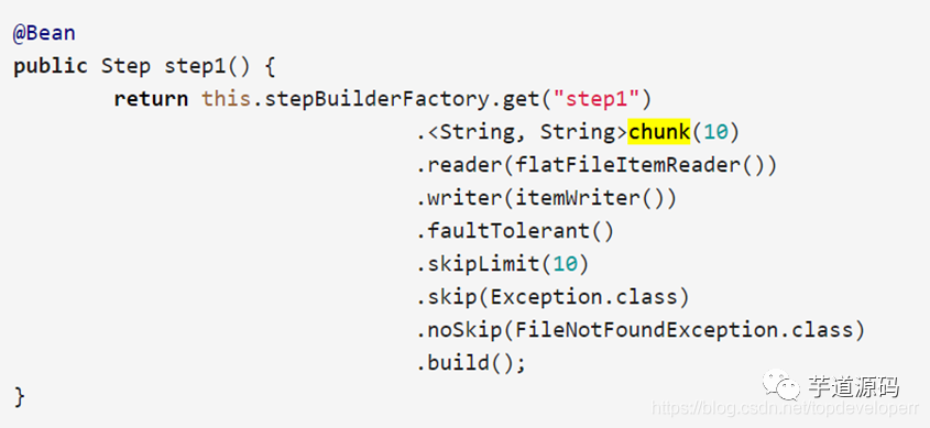skipLimit方法的意思是我们可以设定一个我们允许的这个step可以跳过的异常数量,假如我们设定为10,则当这个step运行时,只要出现的异常数目不超过10,整个step都不会fail。注意,若不设定skipLimit,则其默认值是0.