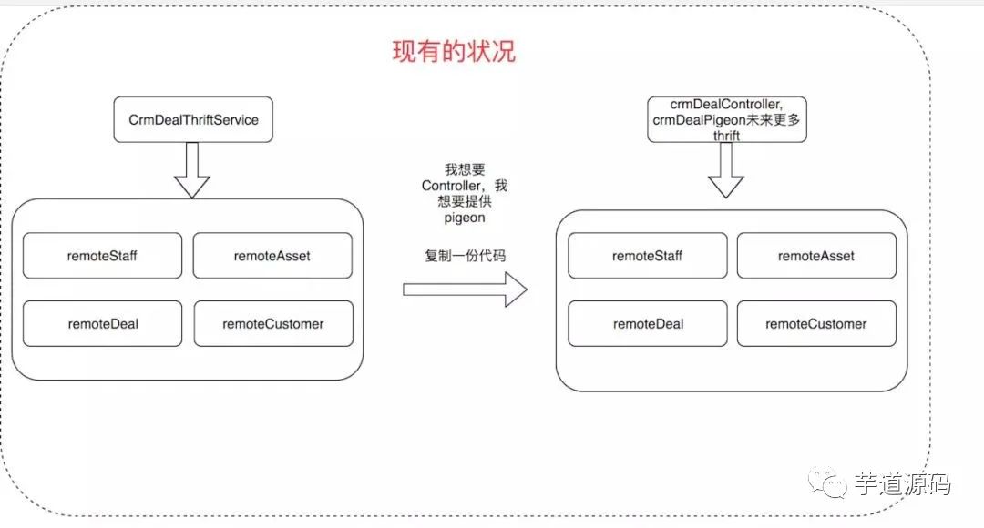 Service :业务层,复用性较低,这里推荐每一个controller方法都得对应一个service,不要把业务编排放在controller中去做,为什么呢?如果我们把业务编排放在controller层去做的话,如果以后我们要接入thrift,我们这里又需要把业务编排在做一次,这样会导致我们每接入一个入口层这个代码都得重新复制一份如下图所示: