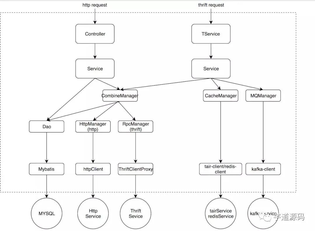 Mannager :可复用逻辑层。这里的Mannager可以是单个服务的,比如我们的cache,mq等等,当然也可以是复合的,当你需要调用多个Mannager的时候,这个可以合为一个Mannager,比如逻辑上的连表查询等。如果是httpMannager或rpcMannager需要在这一层做一些数据转换