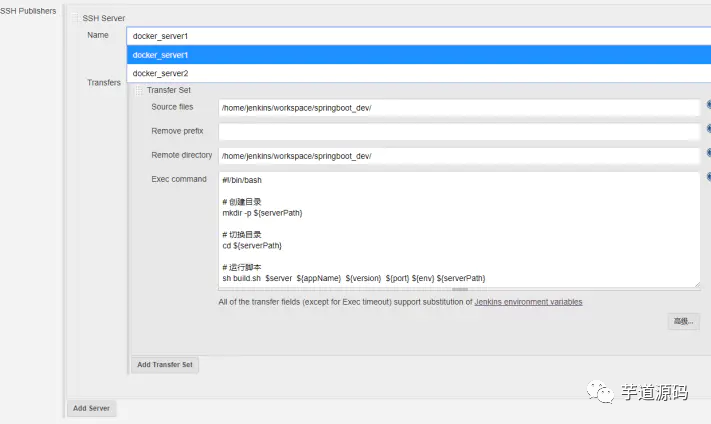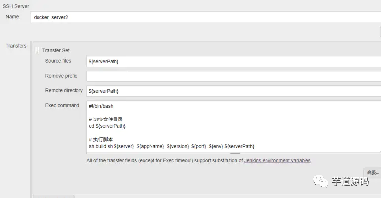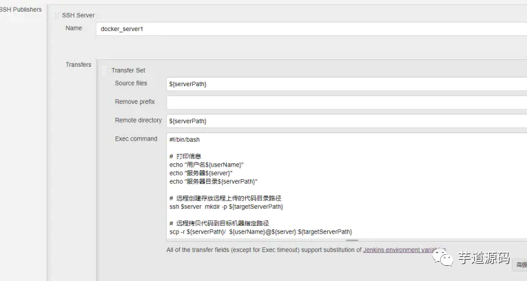 ${serverPath}获取docker_server1表示与Jenkins部署同一个宿主机,使用脚本有远程机器shell脚本操作免登陆操作。