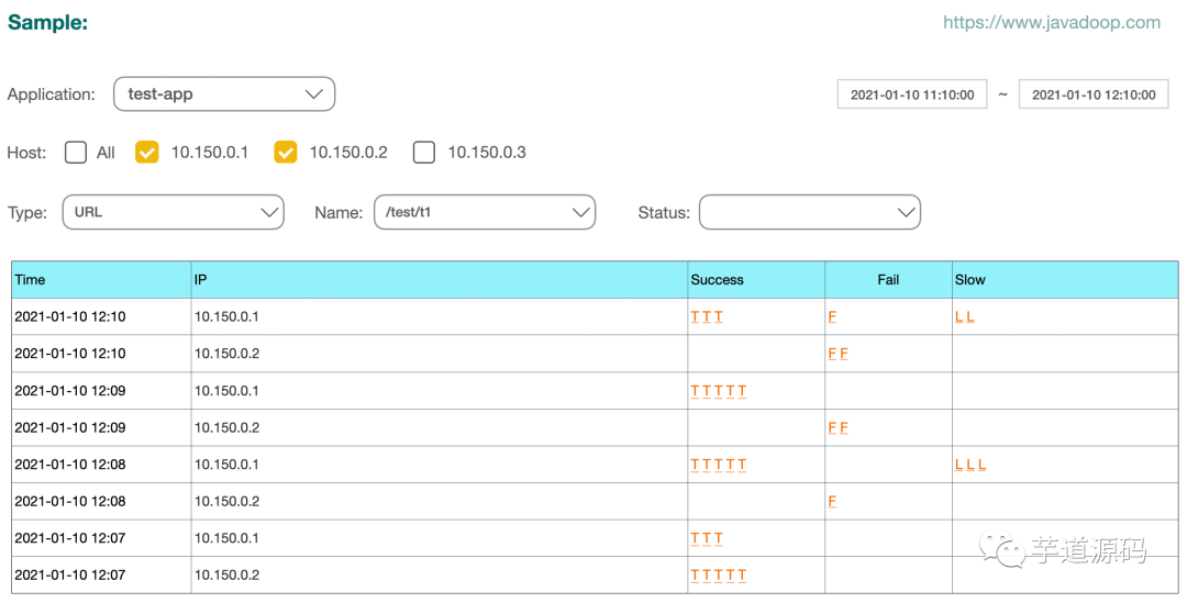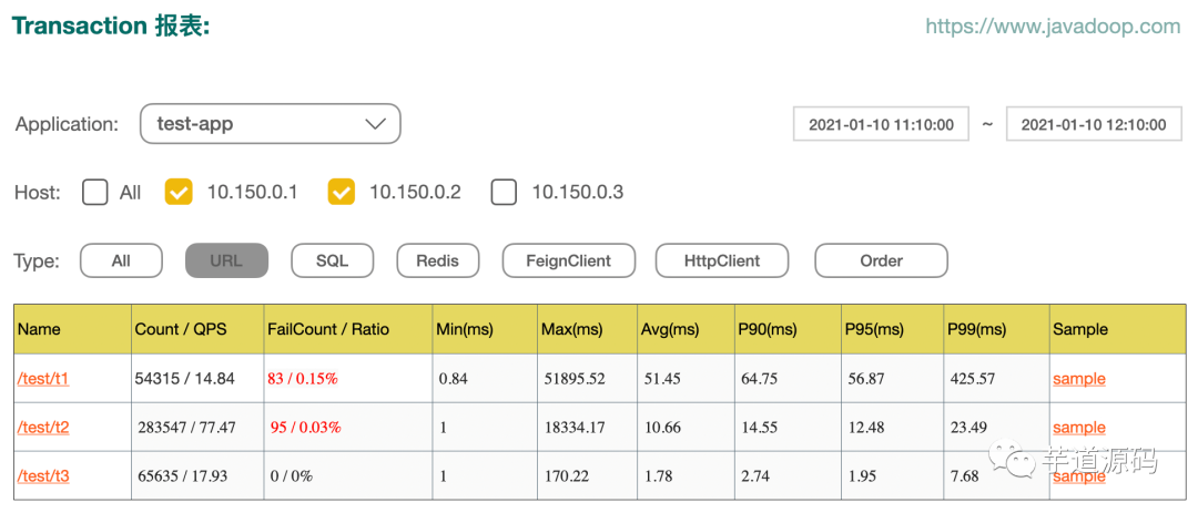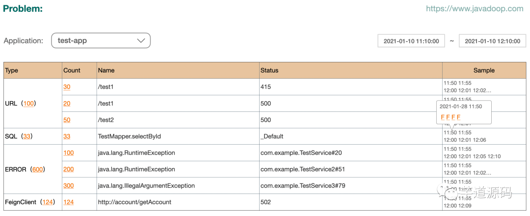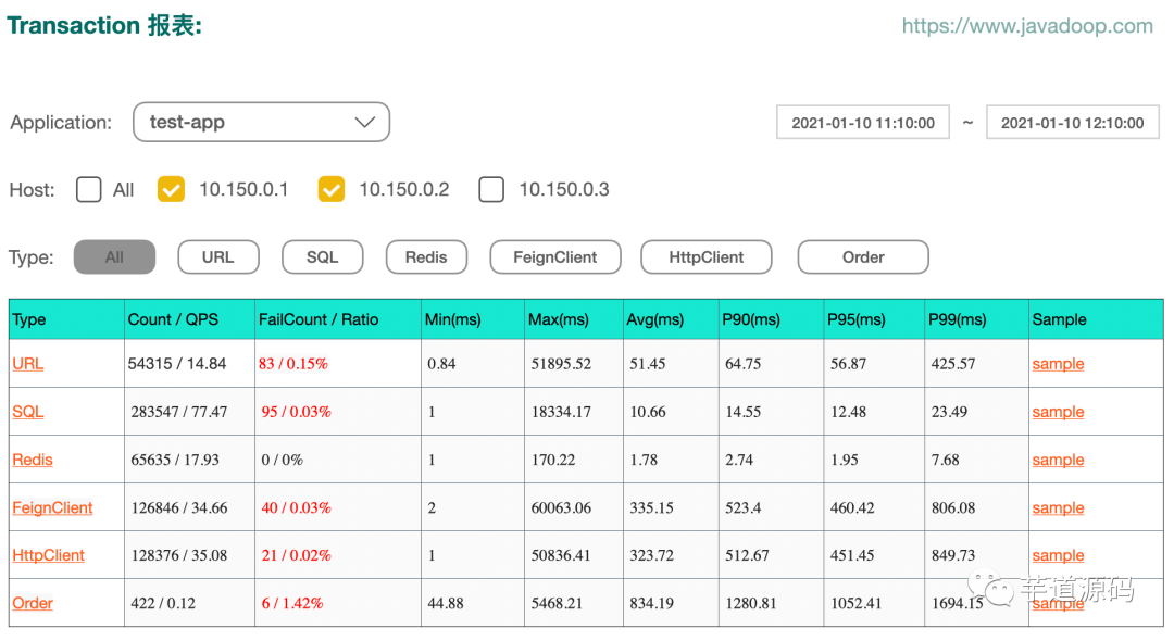 Sample 就是取样的意思,当我们看到有个接口失败率很高,或者 P90 很高的时候,你知道出了问题,但因为它只有统计数据,所以你不知道到底哪里出了问题,这个时候,就需要有一些样本数据了。我们每分钟对 type、name、status 的不同组合分别保存最多 5 个成功、5 个失败、5 个慢处理的样本数据。