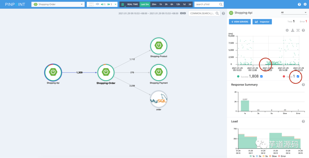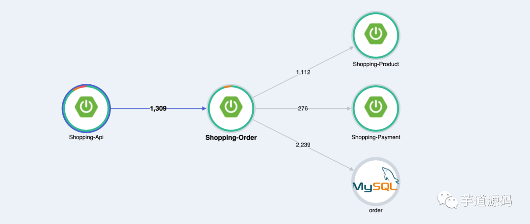 还是看上面这个图,我们看右下角的两个统计图,我们可以看出来在最近 5 分钟内 Shopping-api 调用 Shopping-order 的所有请求的耗时情况,以及时间分布。在发生异常的情况,比如流量突发,这些图的作用就出来了。