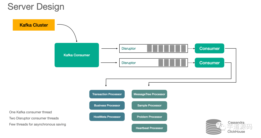 这里我们使用了 2 个 Disruptor 实例,当然也可以考虑使用更多的实例,这样每个消费线程绑定的 processor 就更少。我们这里把 Processor 绑定到了 Disruptor 实例上,其实原因也很简单,为了性能考虑,我们想让每个 processor 只有单线程使用它,单线程操作可以减少线程切换带来的开销,可以充分利用到系统缓存,以及在设计 processor 的时候,不用考虑并发读写的问题。