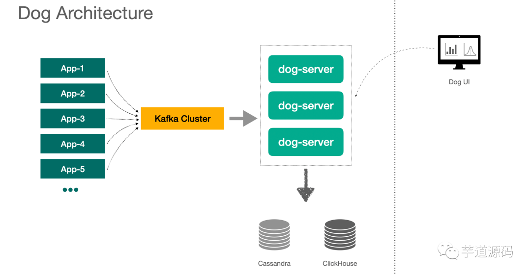 2、Server 端使用了 Lambda 架构模式,Dog UI 上查询的数据,由每一个 Dog-server 的内存数据和下游储存的数据聚合而来。