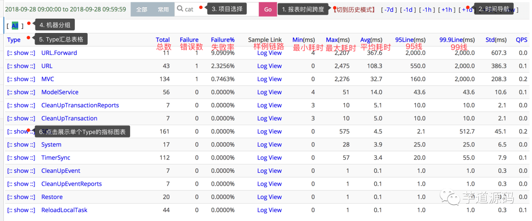 在 Metrics 方面做得比较好的开源系统,是大众点评开源的 Cat,下面这个图是 Cat 中的 transaction 视图,它展示了很多的我们经常需要关心的统计数据: