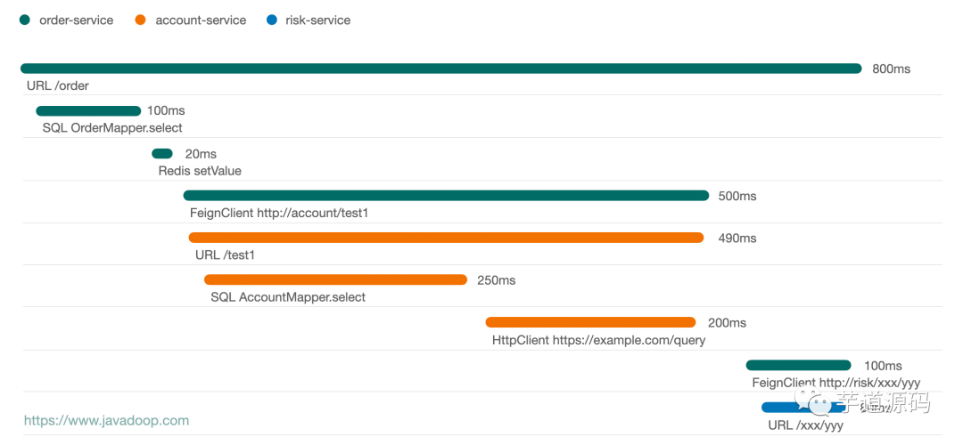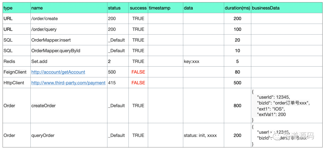 type 为 URL、SQL、Redis、FeignClient、HttpClient 等这些数据,属于自动埋点的范畴。通常做 APM 系统的,都要完成一些自动埋点的工作,这样应用开发者不需要做任何的埋点工作,就能看到很多有用的数据。像最后两行的 type=Order 属于手动埋点的数据。