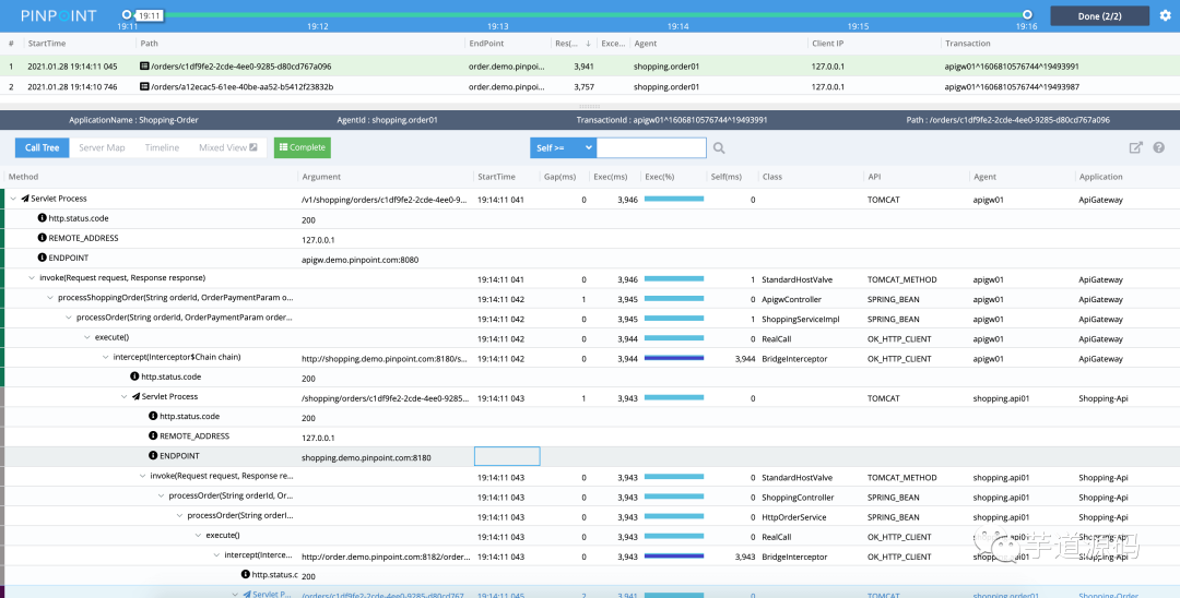 另一个比较好的开源 Traces 系统是由韩国人开源的 Pinpoint,它的打点数据非常丰富,这里有官方提供的 Live Demo,大家可以去玩一玩。