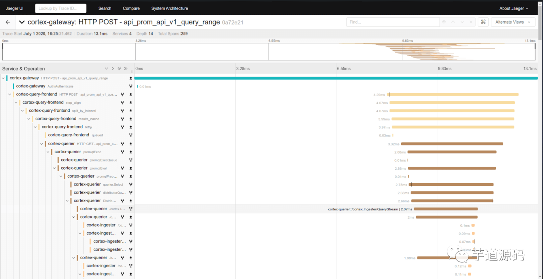 点击上面的 sample 表中的某个 T、F、L 其实就会进入到我们的 trace 视图,展示出这个请求的整个链路: