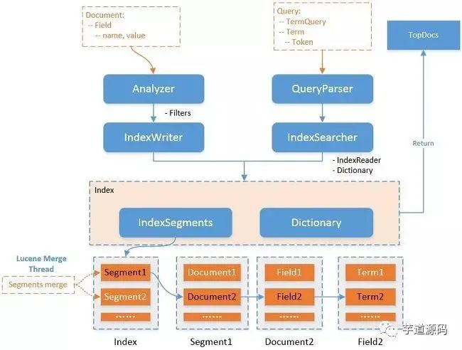 在Lucene中,分为索引(录入)与检索(查询)两部分,索引部分包含 分词器 、过滤器 、字符映射器 等,检索部分包含 查询解析器 等。