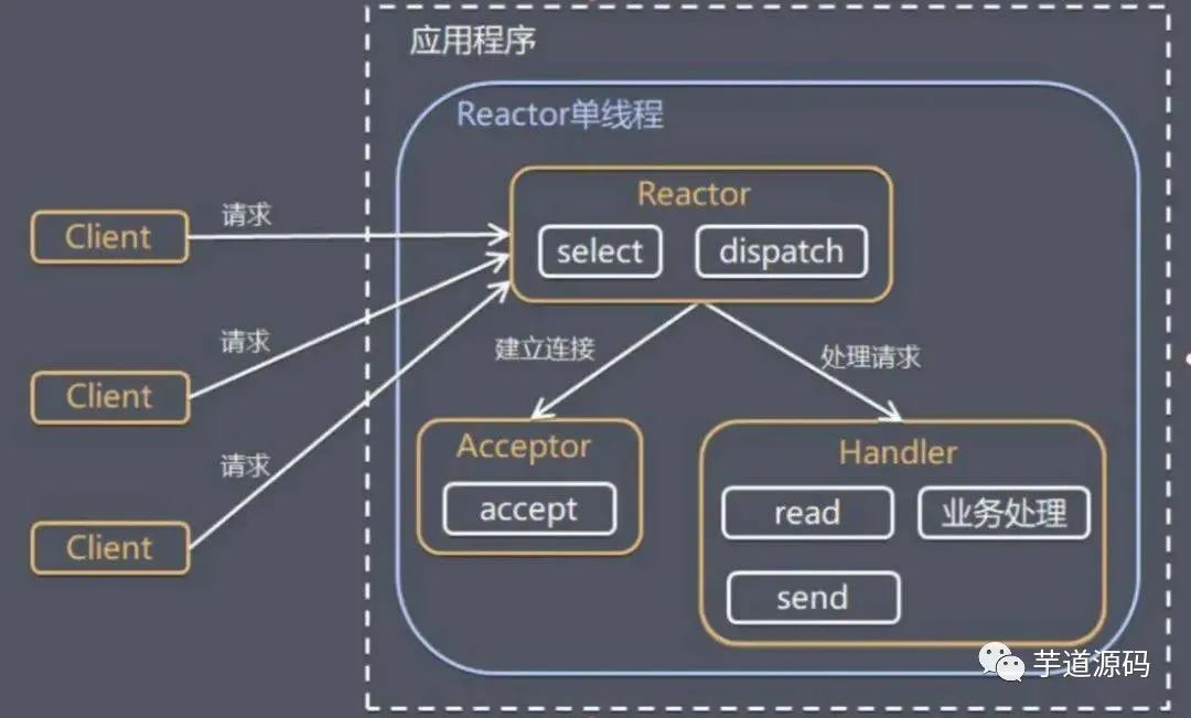 如果建立连接请求事件,则由 Acceptor 负责建立一个连接,然后创建一个 Handler 对象处理连接完成后的业务处理。