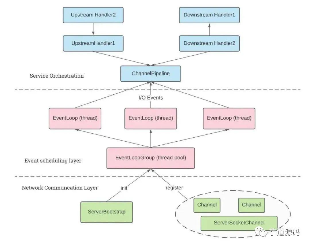 网络通信层 :它执行网络 I/O 操作,核心组件包含 BootStrap、ServerBootStrap、Channel。——Channel 通道,提供了基础的 API 用于操作网络 IO,比如 bind、connect、read、write、flush 等等。它以 JDK NIO Channel 为基础,提供了更高层次的抽象,同时屏蔽了底层 Socket 的复杂性。Channel 有多种状态,比如连接建立、数据读写、连接断开。随着状态的变化,Channel 处于不同的生命周期,背后绑定相应的事件回调函数。