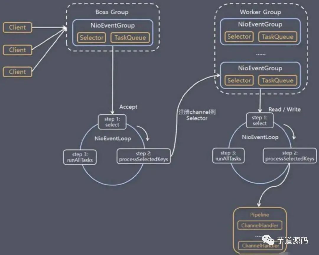事件调度层 :它的核心组件包含 EventLoopGroup、EventLoop。——EventLoop 本质是一个线程池,主要负责接收 Socket I/O 请求,并分配事件循环器来处理连接生命周期中所发生的各种事件。
