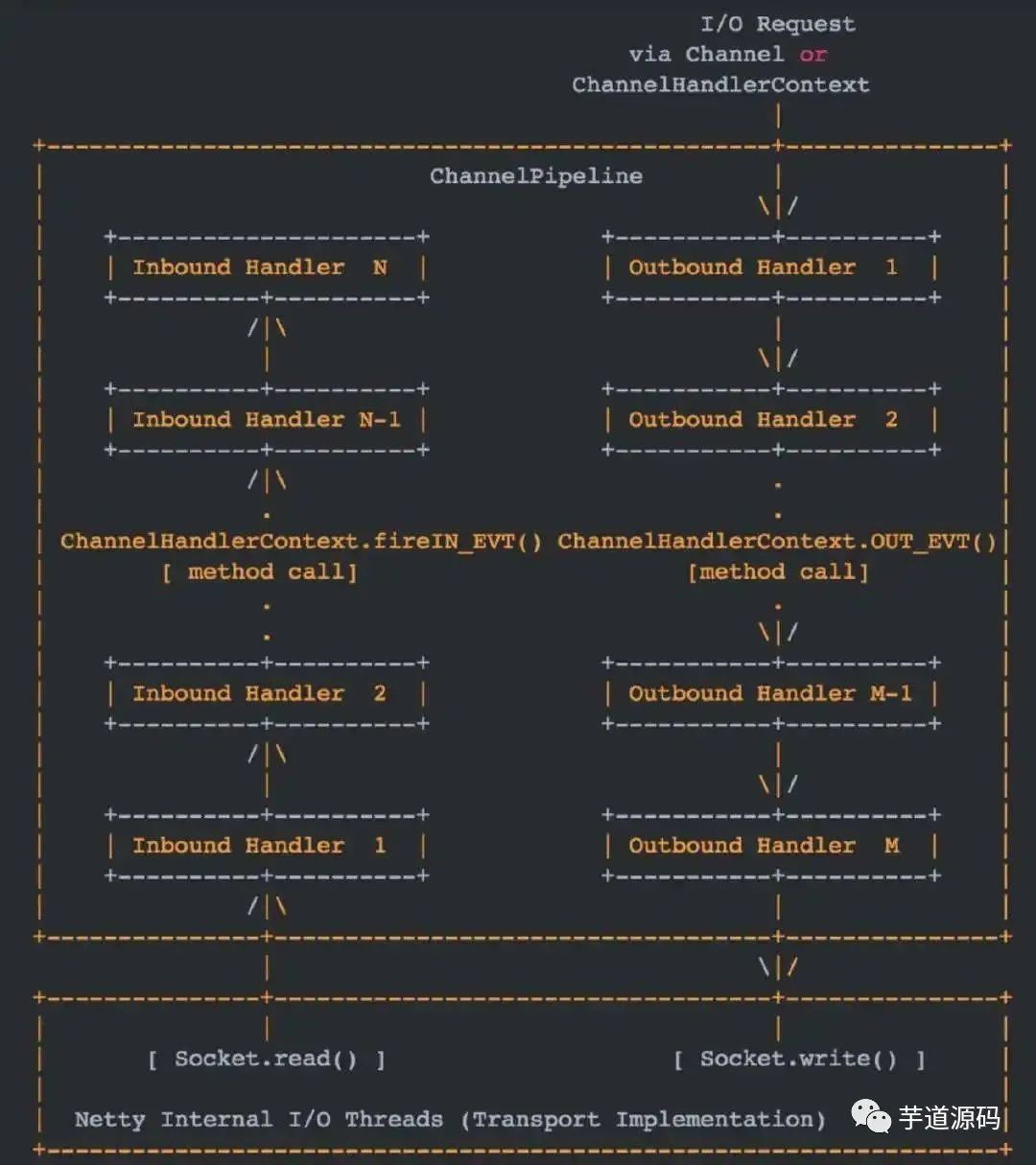 socket。read 经过 TCP/IP 协议栈后,进入 netty 的网络通信层,事件调度层,最后来到服务编排层。而服务编排层的 channelPipeline 的设计也是一个 upstream/downstream 的 stack,一进一出的二个 pipeline。负责处理流入 / 流出的数据包。