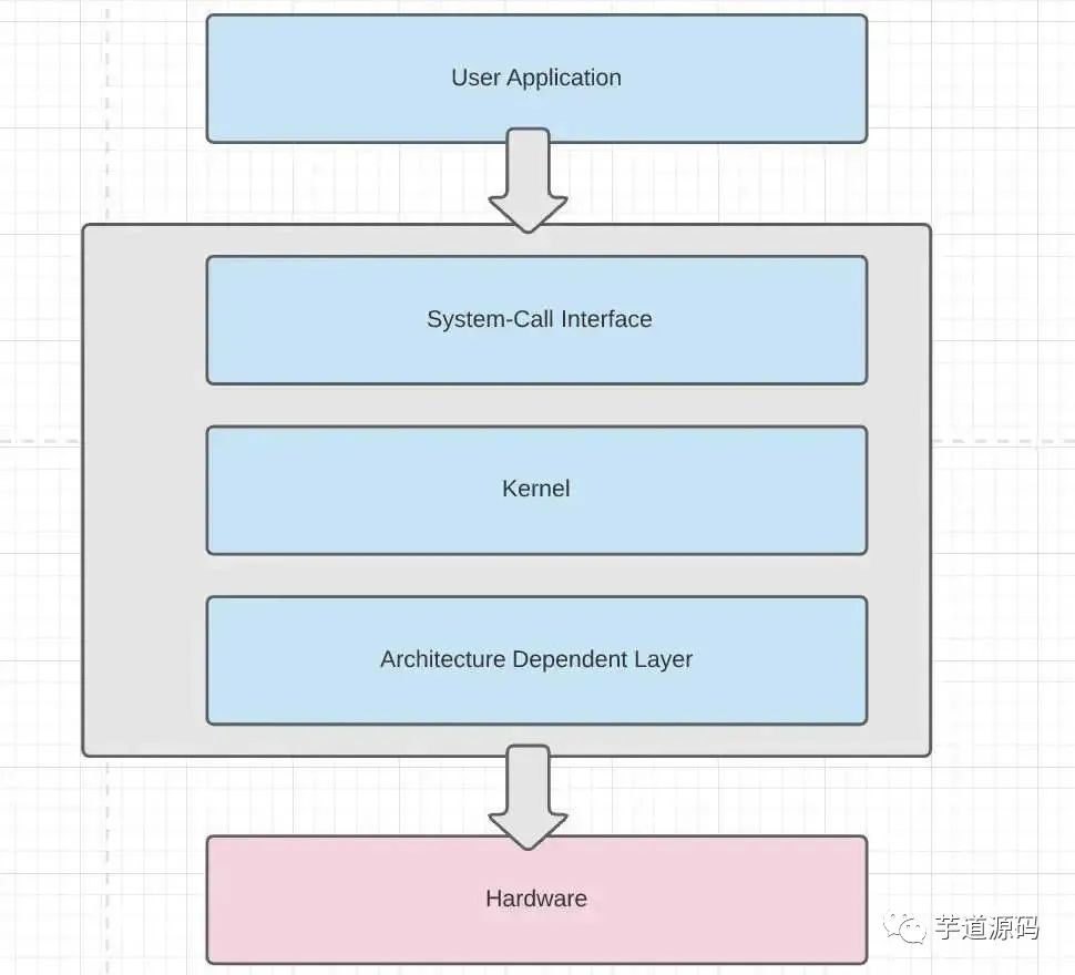 内核接口层区分用户态与内核态,来保护硬件资源受限访问。