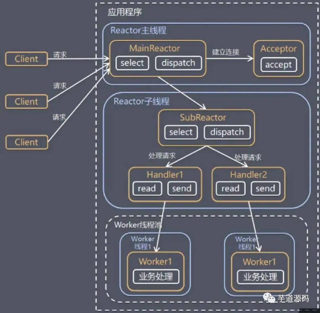 主 React 处理所有 socket 连接事件的监听和响应,而从 React 处理所有 socket 的读写事件的监听与响应。主从 React 都在多线程中运行。