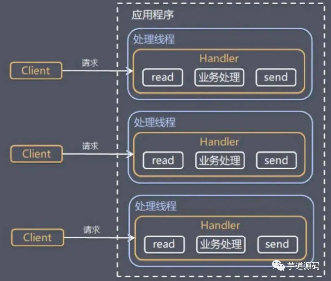 每个连接都需要独立的线程完成数据的输入,业务的处理和数据返回