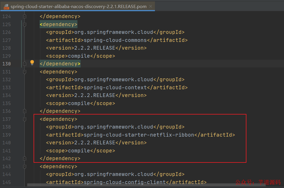其实Nacos集成了Ribbon,何以见得呢?打开spring-cloud-starter-alibaba-nacos-discovery的依赖一看便知,如下图: