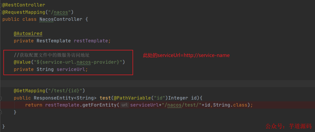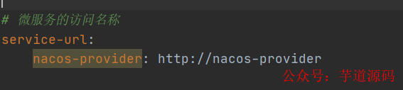 直接使用注册到nacos的中的服务名作为访问地址调用服务,如下图: