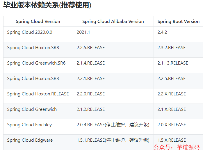 注意:Spring Boot、Spring Cloud、Spring Cloud Alibaba的版本可不是随便选择的,官网明确规定了各个版本的适配:https://github.com/alibaba/spring-cloud-alibaba/wiki,如下图: