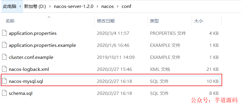 首先在Mysql中新建一个数据库nacos-config(名称随意),然后执行Nacos中的SQL脚本,该脚本是Nacos-server文件夹中的nacos-mysql.sql,如下图: