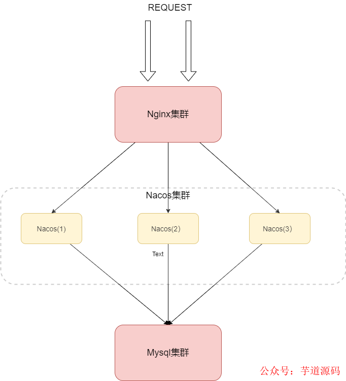 看了陈某画的图是不是更清楚了呢?请求进来先共同Nginx集群进行转发到Nacos集群中,当然为了保持高可用,数据库必须也是集群模式。
