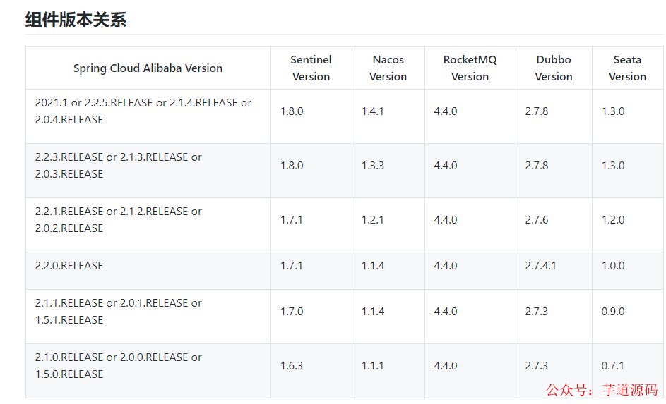不同版本的Alibaba也对应了不同组件的版本,如下图: