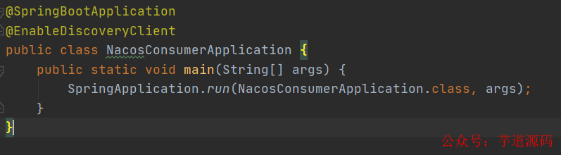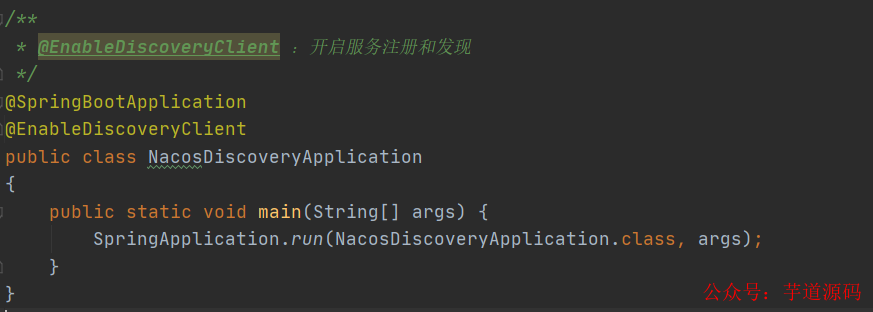 这个大部分Spring Boot功能模块相同,都需要使用@EnableXxxx注解来开启某个功能,否则无法引入自动配置。这里需要使用Spring Cloud的原生注解@EnableDiscoveryClient来开启服务注册发现的功能,如下:
