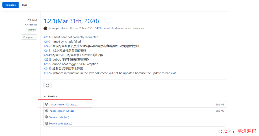 在GitHub上下载自己对应的版本,陈某用的版本是1.2.1,地址:https://github.com/alibaba/nacos/releases/tag/1.2.1