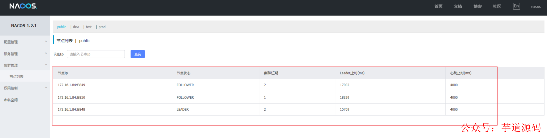 启动成功,访问任意一个端口的Nacos服务,在集群管理->节点列表中将会看到自己搭建的三个节点,如下图:
