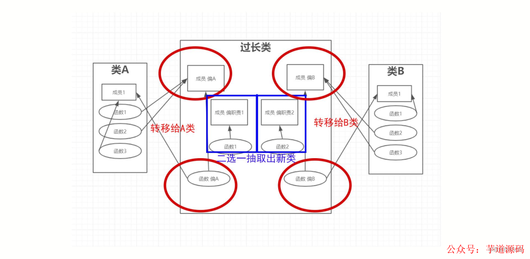 职责1(函数【1】和成员【偏职责1】)和职责2(函数【2】和成员【偏职责2】)由于找不到可转移的合适的类,所以应抽取出一个新的类