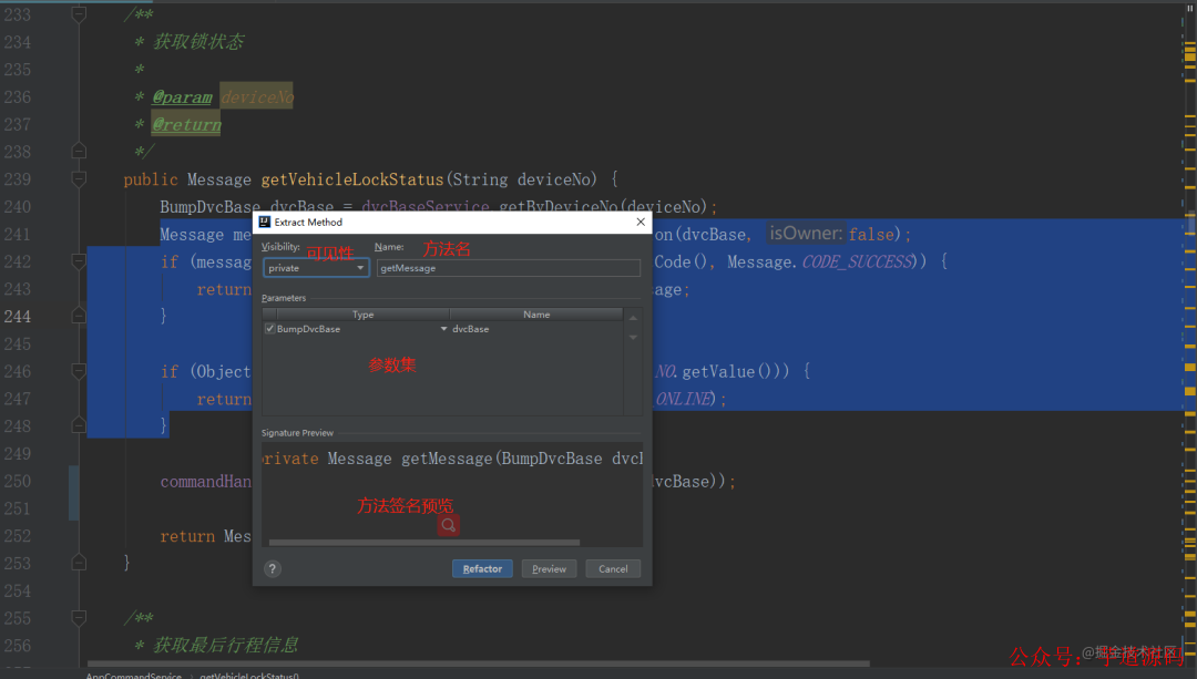 如果你对抽取出的方法的名字、参数、返回值或是修饰符不满意,不要使用Ctrl + R 修改,IDEA提供了重构方法——更改签名(快捷键Ctrl + F6)