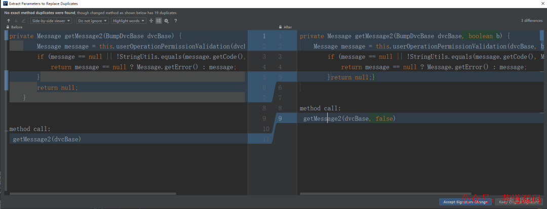 自动检测出个别重复代码的细微差别,有些代码可能只改动一两个变量,IDEA会自动检测出来,并在抽取方法时提醒我们,选择左侧Accept Signature Change(接受签名变动)可以使抽取的方法自动替换更多的重复点