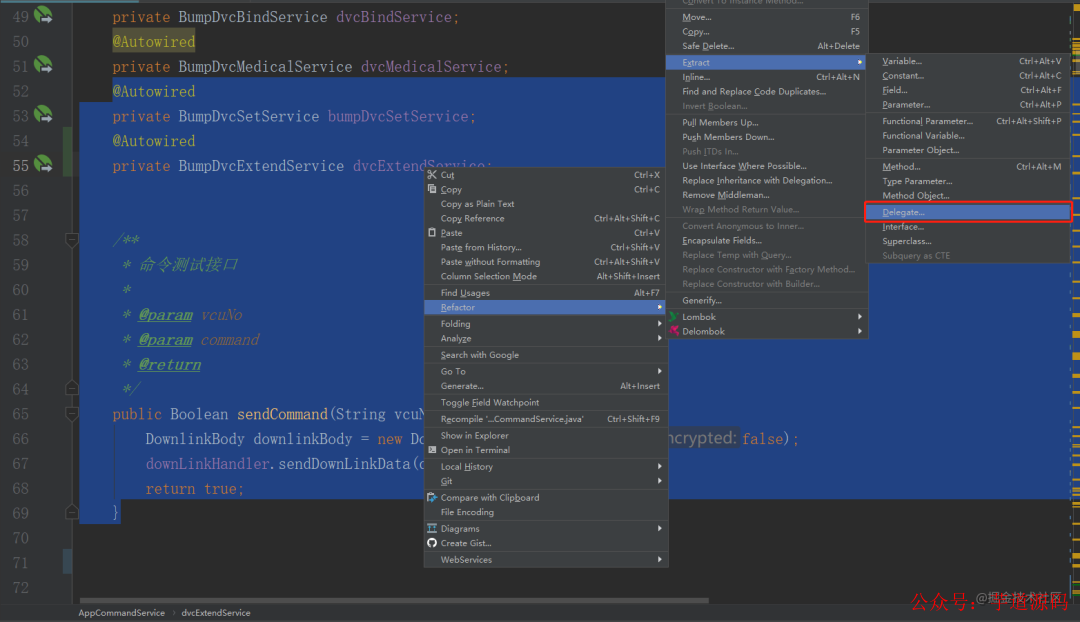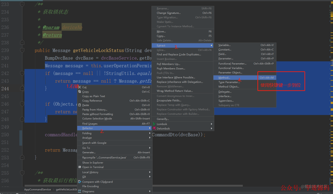 2.进行方法抽取 右键->选择重构->抽取->方法 (或者直接使用快捷键Ctrl + Alt + m)