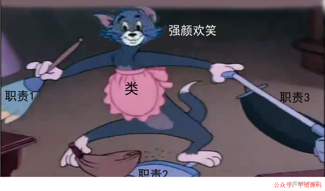 一个类开放几十个接口,绝对存在职责过多的问题,就像图中的Tom猫一样手忙脚乱,一个类的职责过多也有巨大问题: