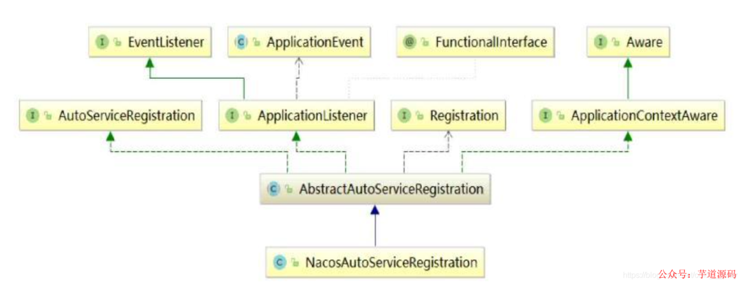 可以看出, AbstractAutoServiceRegistration抽象类实现了该接口,并且最重要的是NacosAutoServiceRegistration继承了AbstractAutoServiceRegistration。