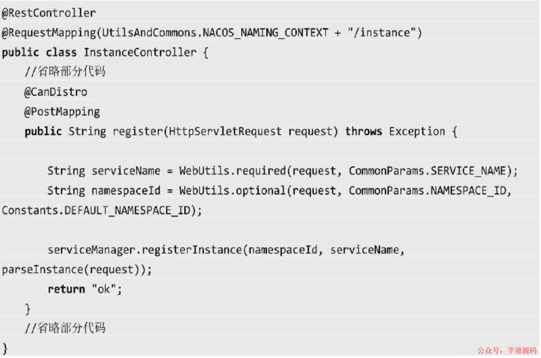 对于nacos服务端,对外提供的服务接口请求地址为nacos/v1/ns/instance,实现代码咋nacos-naming模块下的InstanceController类中: