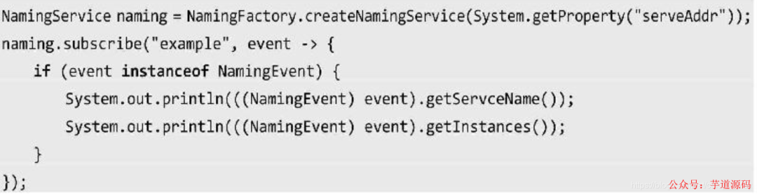 可以通过subscribe方法来实现监听,其中serviceName表示服务名、EventListener表示监听到的事件: